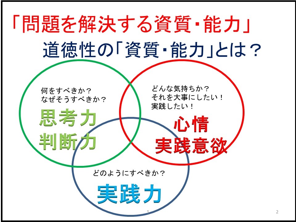 特別の教科「道徳」の目標から,「・・よりよく生きるための基盤となる道徳性を養うために,道徳的諸価値についての理解を基に,自己を見つめ,物事を多面的・多角的に考え,自己の生き方についての考えを深める学習を通して,道徳的な判断力,心情,実践意欲と態度を育てること」と,表記されています。