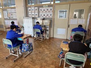 4年生の算数科の授業では、「分数」のテストに挑戦します。これまでに学習した「真分数」「仮分数」「分数の大小」、分母が等しい「たし算」「ひき算」の問題に取り組みます。