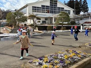 チャレンジタイムに縄跳び練習をする1・2年生。2学期よりも縄跳びが上手になっています。