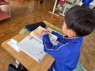 1年生の算数科の授業では、「おおきいかず」の学習です。「一の位が2の数はどれかな?」「十の位が4の数はどれかな?」教科書巻末の表を使って数の並び方を調べます。
