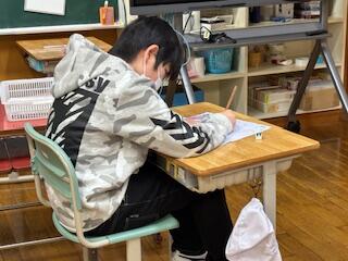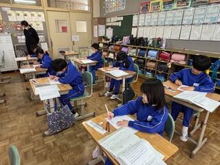 6年生の算数科の授業では、「算数の学習をしあげよう」の学習です。6年間で学習してきた内容について、テストに取り組みます。間違えた問題はきちんと直しておくことが大切ですね。