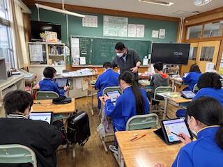 6年生の理科の授業では、「理科とプログラミング」の学習です。タブレットを使って、自分で描いたイラストなどを使って、工夫しながらプログラムをつくり、友だちに発表し合います。