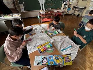 1年生の生活科の授業では、「ふゆをたのしもう」の学習です。好きな絵を描いて、「ぐにゃぐにゃだこ」を作ります。青空の下、1年生が作った凧をあげるのが楽しみです。