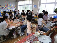 7月7日(水)、授業参観日に合わせ、1年生の保護者の方を対象に親子給食会が行われました。親子給食会では、子どもたちが準備をしているところも見ていただきました。そして、お家の人と一緒に食べる給食は、いつもよりもうれしかったようで、1年生のみんなは元気もりもり食べていました。
