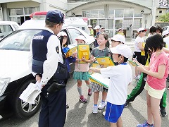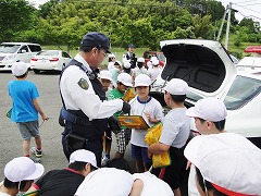 話の後、警察の方が身に付けている装備品やパトカーの中やトランクに入っているものを見せていただきました。次から次へと質問を投げかけながら、一生懸命にメモを取る様子から、充実した学習となったことがうかがえました。