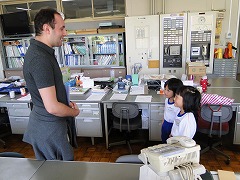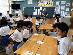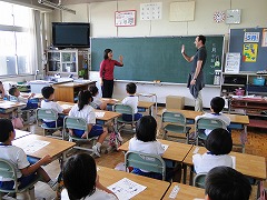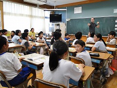 本校では、年間35時間、週あたり1回の割合で、英語による外国語活動を行っています。そのうち月1回は、白沢中学校に勤務するジェフリー先生に来ていただき、各学年で一緒に英語の学習を行っています。