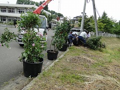 先日まで、埼玉県所沢市にある西部プリンスドームで開催されていました、国内最大規模の祭典「第18回国際バラとガーデニングショウ」で展示されておりました約100万輪のバラの一部を、校長先生のお知り合いを通して、数十株いただきました。それを、職員駐車場入口や西校舎前の花壇、体育館脇の土手に植えていただきました。鉢植えのものからバラの木に成長した数十年物のバラまで、クレーンを使い、庭師の方々に一日かがりで植樹していただきました。