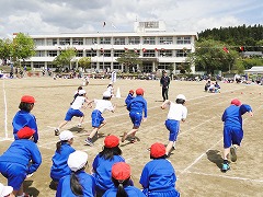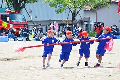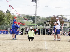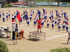 応援合戦や綱引き、騎馬戦などでは、子どもたちの気合いが伝わってきました。徒競争では、子どもたちの緊張と興奮、気合いが伝わってきました。保護者や消防団との競技では、和気あいあいとした雰囲気が素敵でした。他にも、消防団によるポンプ操法のきびきびとした動き、婦人会や交通安全母の会と子どもたちでダンスした「恋するフォーチュンクッキー」、隊形移動しながらの見事な演奏を見せた鼓笛パレードなど、どれもが素晴らしく、運動会を盛り上げました。