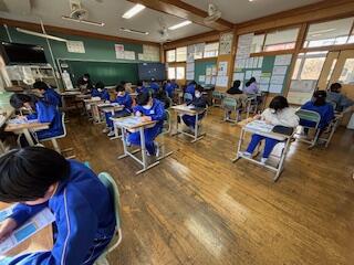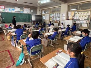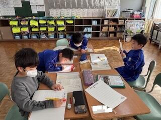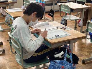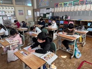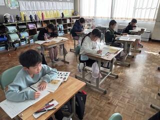 4年生の国語科(書写)の授業では、「書きぞめ」の学習です。先週、特別非常勤講師の佐々木先生に教えていただいたことを思い出しながら、集中して「初日の出」の作品を仕上げます。
