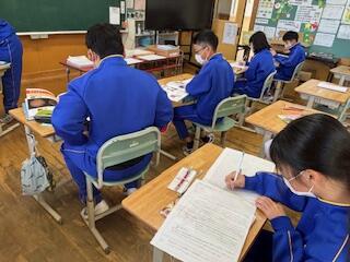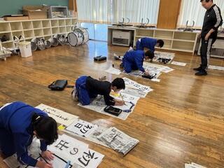 6年生の国語科(書写)の授業では、「書きぞめ」の学習です。特別非常勤講師の佐々木先生に教えていただいたことを思い出しながら、集中して毛筆「雪の連山」に取り組みます。
