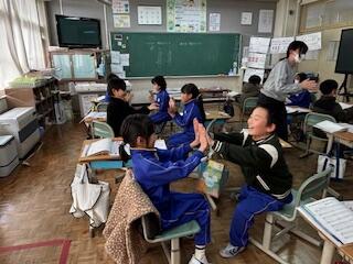 3年生の音楽科の授業では、「日本と世界の音楽」の学習です。「陽気なかじや」の曲に合わせて、いろいろな手遊びをします。ペアで手遊びを考え、気持ちを合わせて楽しく取り組みます。
