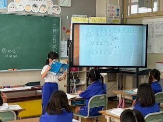 2年生の算数科の授業では、「九九をつくろう」の学習です。「L字型にならんだチョコレートの数を計算でもとめられないかな?」自分の考えを分かりやすく友だちに伝える姿がすばらしいです。
