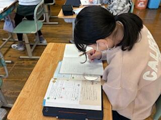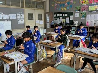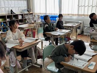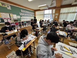 5年生の国語科(書写)の授業では、「書きぞめ」の学習です。「平和な里」を「平和」と「な里」に分けて練習した後、名前を書く位置をバランスよく決め、名前の中心線も意識して練習します。