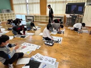 6年生の国語科(書写)の授業では、「書きぞめ」の学習です。ひざのつき方や手の位置など、床を使って書く場合の姿勢を確認しながら、「雪の連山」を練習します。