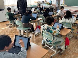 1年生の生活科の授業では、「タブレットの使い方」の学習です。タブレット一斉持ち帰りに合わせて、タブレットの使い方を確認します。タブレットのイラストに色を塗ることも上手にできています。