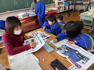1年生の国語科の授業では、「じどう車くらべ」の学習です。自分で選んだ自動車についての本を読んで、その自動車の「しごと」と「つくり」について調べ、ノートに書きます。