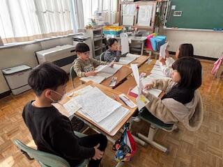 6年生の算数科の授業では、「順序よく整理して調べよう」の学習です。「4チームから2チームを選ぶときの試合の組合せは?」「AとB、BとAの組み合わせは・・・」樹形図や表を使って考えます。