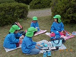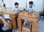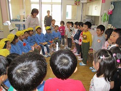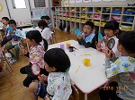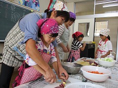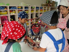 年長さんは、幼稚園で採れたさつまいもを使い『黄金カレー』を作りました。年少さんは、いつも幼稚園で飲んでいるおいしい牛乳を使ってフルーチェを作りました。年長さんのカレーに大喜びで、たくさんおかわりをした年少さんです。年長さんも、自分たちが作ったカレーのおいしさに、野菜が苦手な子ども達ももりもりと食べていました。最後に、年長さんのクラスに行き、お互いに作ってくれたお礼をしました。