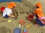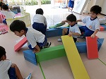 年少さんは、久しぶりに会う友達との触れ合いを喜びながら、夏休みに経験した船を積み木で作ったり、お化け屋敷ごっこをしたりしています。戸外ではブランコや砂場、枝を使ったお絵かきを元気いっぱい楽しんでいます。