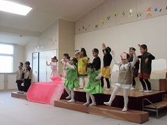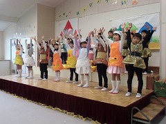 年少組「てぶくろ」オペレッタ、 年長組「金のがちょう」言語劇の発表の様子です。その他、歌、合奏、ダンス、よさこい等を発表しました。