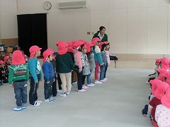 白岩幼稚園の先生や園長先生のお話を真剣に聞いていました。糠沢幼稚園のお友達は、少し緊張しながらの自己紹介です。「ピンクの帽子の人、一杯いるね」のつぶやき。
