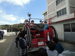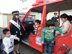 「秋季全国火災予防運動行事」の一環として一日消防団長・消防団長・他6名の方々が訪問され、子どもたちへの防火啓蒙をしていただきました。ホールにて消防団長さんのお話や、一日消防団長の大澤さんより紙芝居や防火のメッセージの伝達をしていただき、皆で『防火のちかい』を朗読しました。最後に、消防自動車に乗せていただき大満足な子どもたちでした。