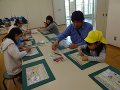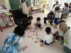 オリジナルのけん玉を作って遊びました。また、「お手玉・おはじき・こま・めんこ・あやとり」の各コーナーではおじいさん、おばあさんに遊び方を見せていただいたり、丁寧に教えていただいたり、園児との温かな触れ合いの様子は、心なごむひとときでした。