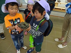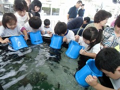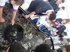 そのあと、糠沢小学校さんのはからいで、移動水族館を見学。「ヒトデ」や「なまこ」にふれたり「伊勢海老」が色を変えたりする様子に大歓声!