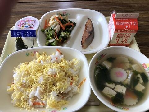 【今日の献立】ちらし寿司、きざみのり、きんしたまご、あさりのすまし汁、ぶりの照り焼き、なのはなのおひたし、三色ゼリー、牛乳