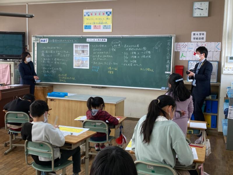 1月28日(木)、時事通信社から放射線教育に関する取材を受けました。今日は、4学年の総合的な学習の様子を見てもらいました。子どもたちは、先日双葉郡を見学に行ってきたことから分かったことや感じたことを発表し合いました。そこから、津波や原子力発電所の事故から受けた被害のものすごさに対する感想だけではなく、復興に向けてねばり強く取り組む人々の姿にも目を向け、未来志向の話し合いを進めていました。