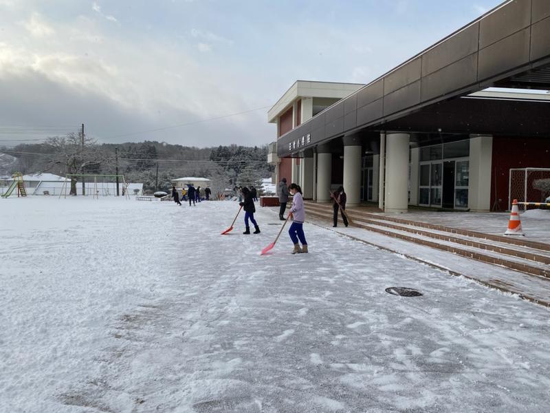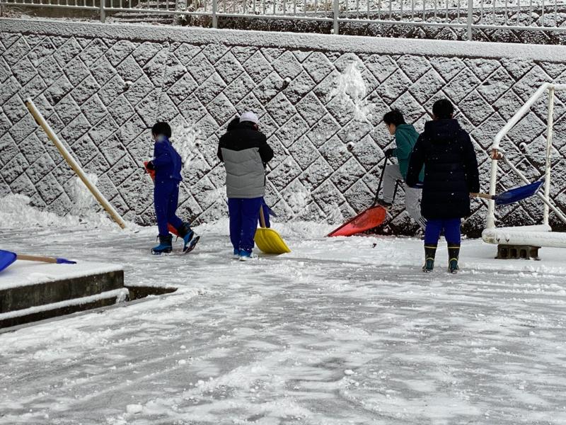 写真は、高学年の児童が雪かきをしている様子です。登校した順に外に出て、奉仕作業に取り組んでくれました。おかげで、滑って転ぶ下級生もなく、安全に生活することができました。日曜日までは寒さが続く予報が出ているので、月曜日の登下校の際にも気をつけるように話をしました。