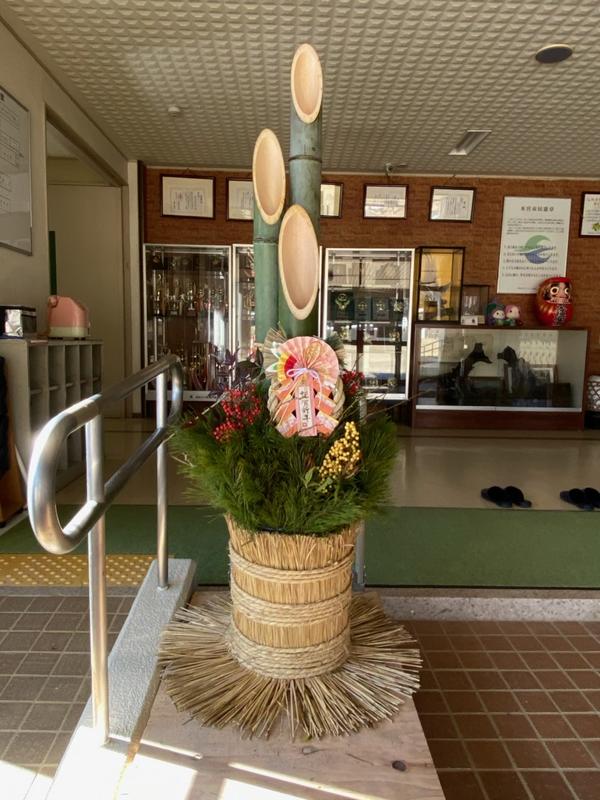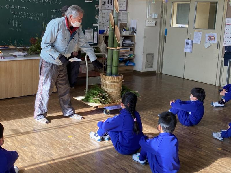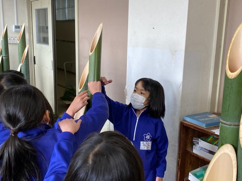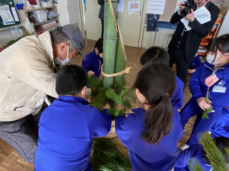 最終的に子どもたちが作業に加わった門松は、センターのご厚意により、学校に寄付していただくことになり、仕上げを行った立派なものが玄関に飾られました。近くを通ることがありましたら、お立ち寄りください。