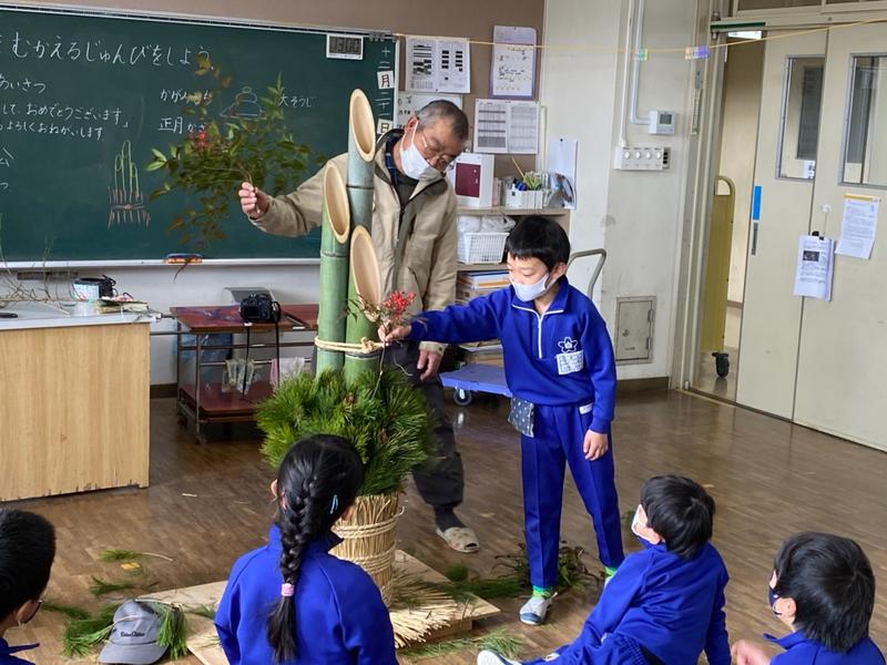 12月21日(月)には、シルバー人材センターの方と2年生が交流する機会を設けました。作業している様子を見学したり、門松を飾る意味について質問して話を聞いたりした後に、実際に松を飾る体験をさせていただきました。