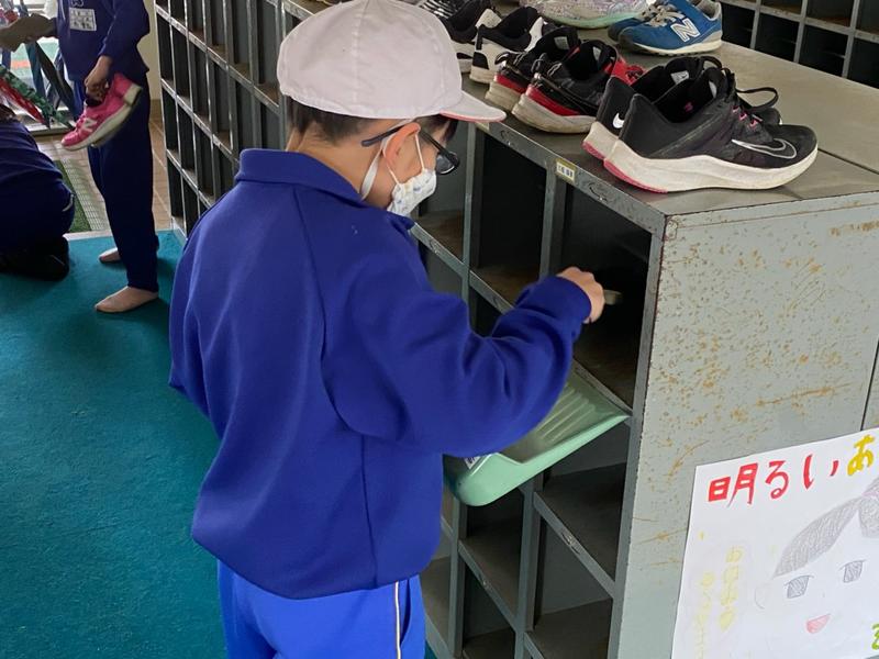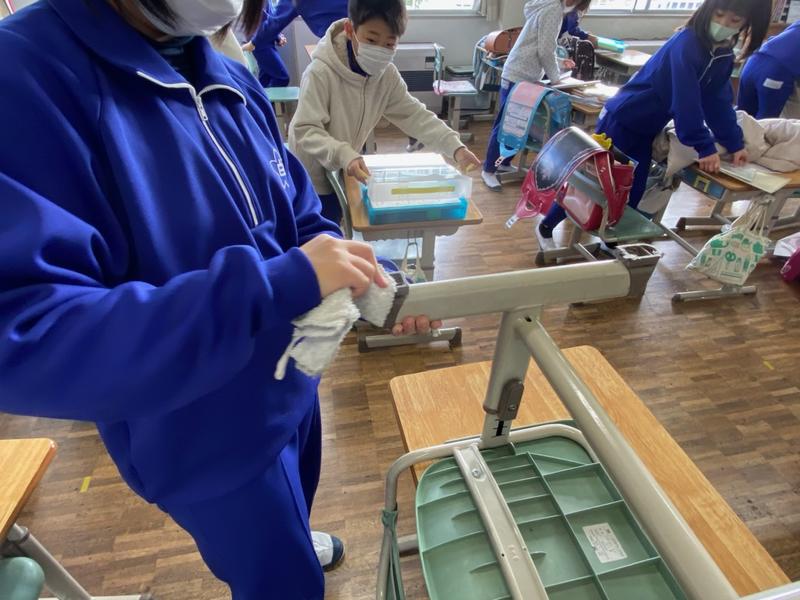 12月22日(火)、明日で第2学期が終了するので、全校生で大掃除をしました。机や椅子の脚、下足入れ、チョークの粉受け、棚の裏側など、普段の清掃時間では行き届かないところにまで目を向けてきれいにしました。