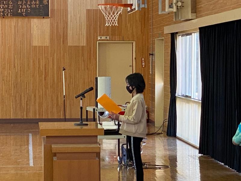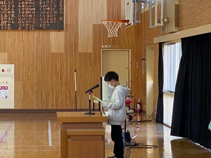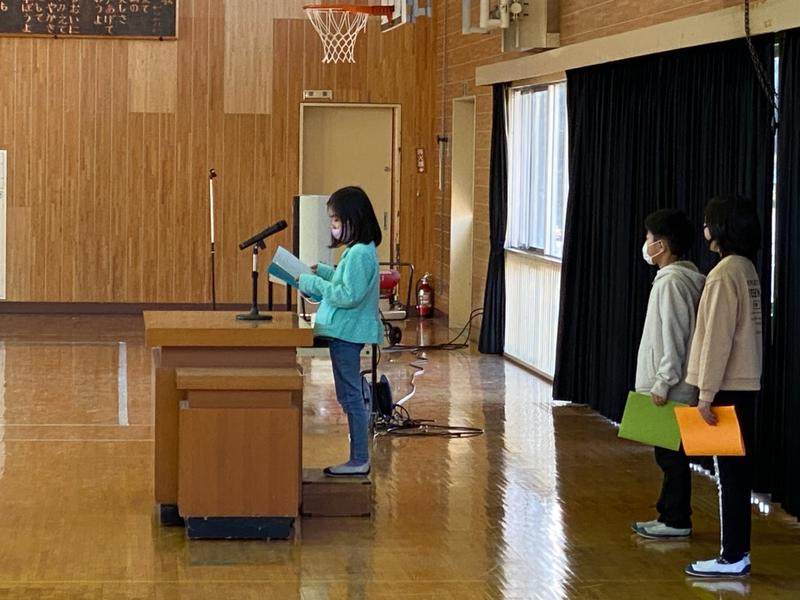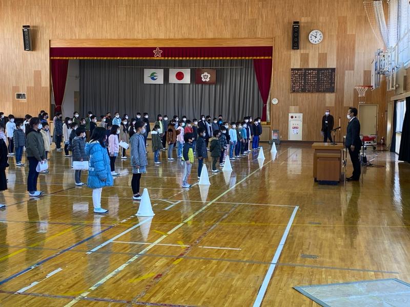 12月23(水)、第2学期の終業式を行いました。子どもたちには、①命を大切にすること、②家族とのふれあいを大切にすること、③規則正しい生活をすることについて、校長と生徒指導担当から話をしました。また、代表児童3名が2学期の振り返りと冬休みの抱負を発表しました。3人とも、とても立派な発表内容でした。