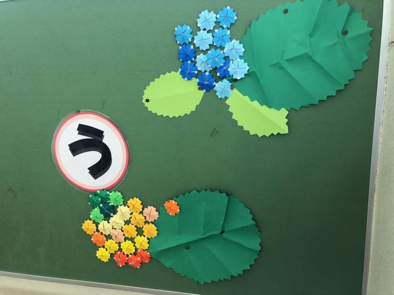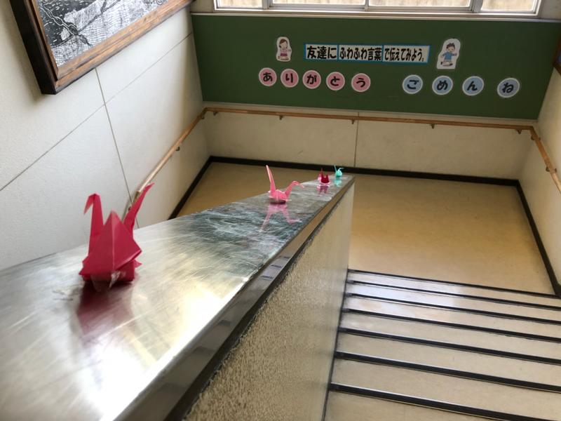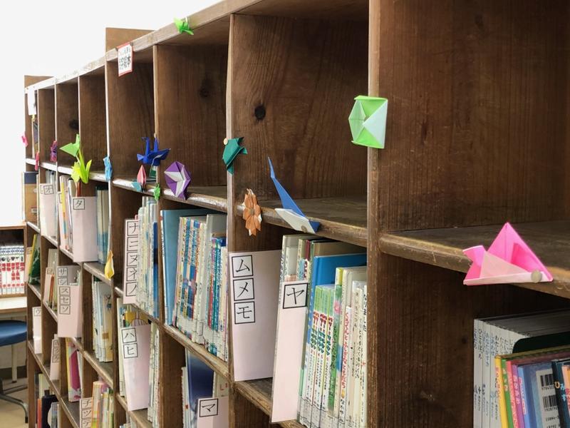 校舎内を歩くと、所々に折り紙による作品を見かけます。あいさつを促す掲示の脇にあるあじさい。図書室の書棚にあるかぶとやかえるや花。階段の手すりには鶴。