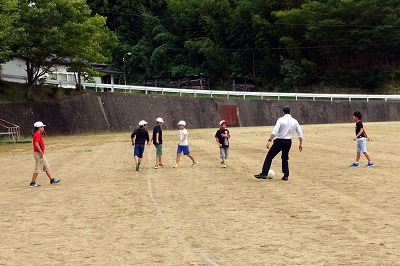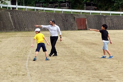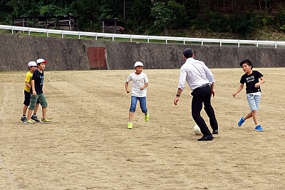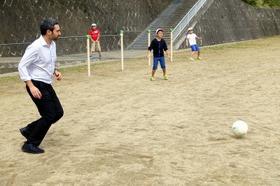 子どもたちは、休み時間にはさっそくサッカーに誘って、