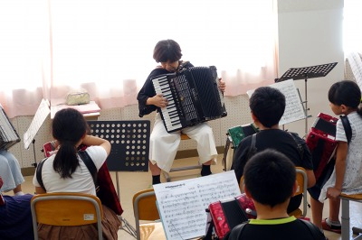 はじめに、曲を通して聴いてもらったり、講師のアコーディオン演奏を鑑賞したりしました。