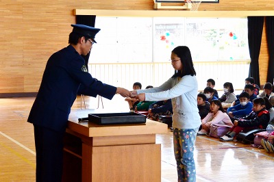 代表児童が、白岩駐在員から委嘱状を受け取り、