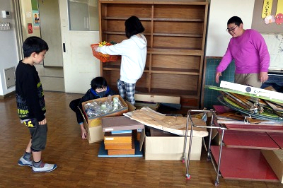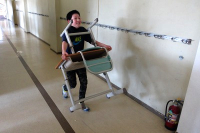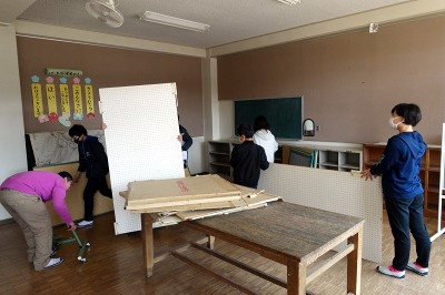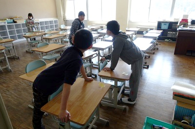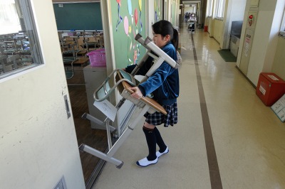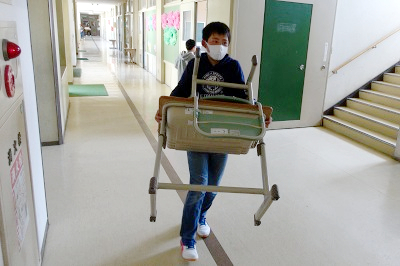 各教室の机やいすを、新年度の児童数に応じて搬出搬入したり、