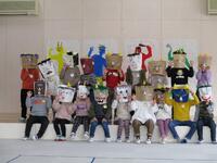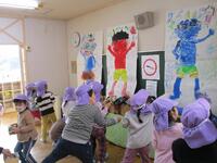 自分達で描いた鬼に向かって、心の中にいる「泣き虫鬼」や「食いしん坊鬼」を退治する子ども達。