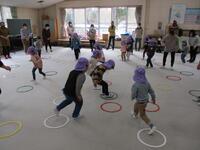 年少さんは、ラバーリングを使用し色鬼をしました。年長さんはスカーフを