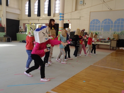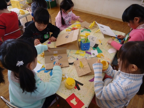 自分で作った鬼の面をかぶり、年少さんは段ボールの鬼に、年長さんは、グループごとに作った壁面の鬼に向かって元気よく「ふくはーうち おにはーそと!!」と豆をまきました。
