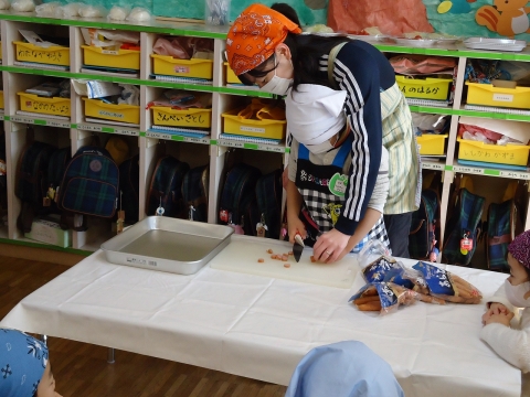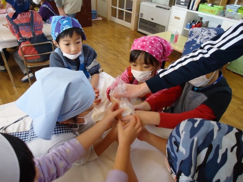 2 袋から出し、生地を2等分して丸めておく。(乾燥しないように布巾をかける。)今回、年少さんは1枚大きいものを作りました。この時間に年長さんは、ウインナーを切りました。