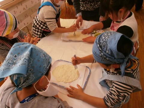 食育活動の一環として、5日(木)は、JA安達米粉ピザ研究会のご協力を得ながら、米粉ピザ作りをしました。