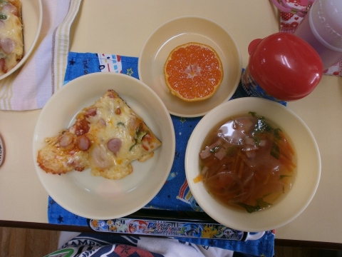 メニューは・・・ ピザ、コンソメスープとみかん半分