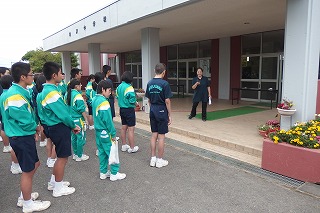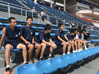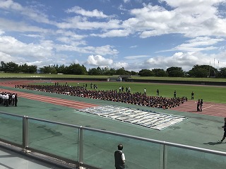 晴天に恵まれ、9時30分から開会式が開かれました。生徒たちは、リラックスできた状態でアップもでき、本番に備えています。開会式で一番外側に並んでいました。応援の生徒もきちんとした態度で参加しました。