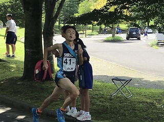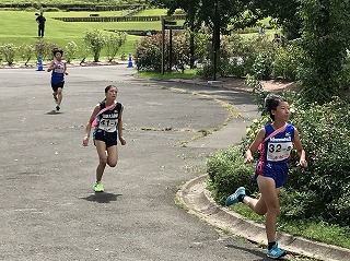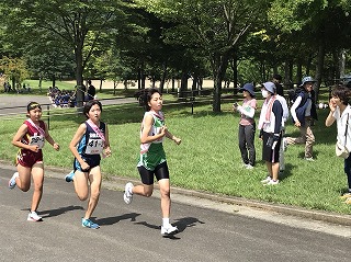 台風一過の中、11時にスタートした女子は、1区酒井(伶)さんが区間10位。それを1年生の三瓶(瑞)さんが区間3位の力走で7位に押し上げました。3区酒井(月)が10位、4区稲田さんが13位と上位に食らいついて行きました。アンカーの1年生三瓶(詩)さんが距離が長い3kmをがんばり、最後15位でゴールしました。昨年度より大幅に順位を上げました。お疲れ様でした。