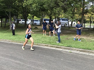 1区渡邊(響)さんが22位で襷を2区につなぎました。その後2区石橋さんが22位をキープ、3区國分(遥)さん、4区長谷川さん、5区佐藤(圭)さんとつなぎ、6区アンカーの服部さんが31位でゴールしました。暑い中でなかなか力が発揮できない面もありましたが、しっかりみんなで襷をつなぐことができました。お疲れ様でした。
