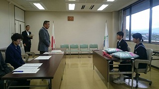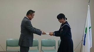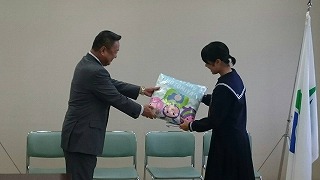 27日~29日に横浜で開催される第48回ジュニアオリンピック陸上競技大会に出場する3年の中野胡桃さんの出場報告会が、本日本宮市役所で行われました。中野さんは、9月初旬に開催された県大会において、ジャベッリクスロー競技で大会新記録で優勝し、全国大会の出場権を獲得しました。同じく砲丸投げで出場する本宮二中の遠藤さんと共に今回の報告会となりました。高松本宮市長より目録と本宮市のクッションを記念にいただきました。